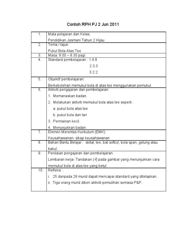 Download sample p.jasmani tahun 1 (kssr semakan). Rph ini adalah bentuk rph terbaru (mungkin ikut masa di upload & sumber) bagi subjek pendidikan jasmani tahun 2. Rph sains dan teknologi tahun 2. Rancangan pengajaran harian (rph) ialah satu rekod khas yang disediakan lebih awal oleh guru sebelum menjalankan sesi pengajaran dan pembelajaran. 5 amanah bilangan murid :