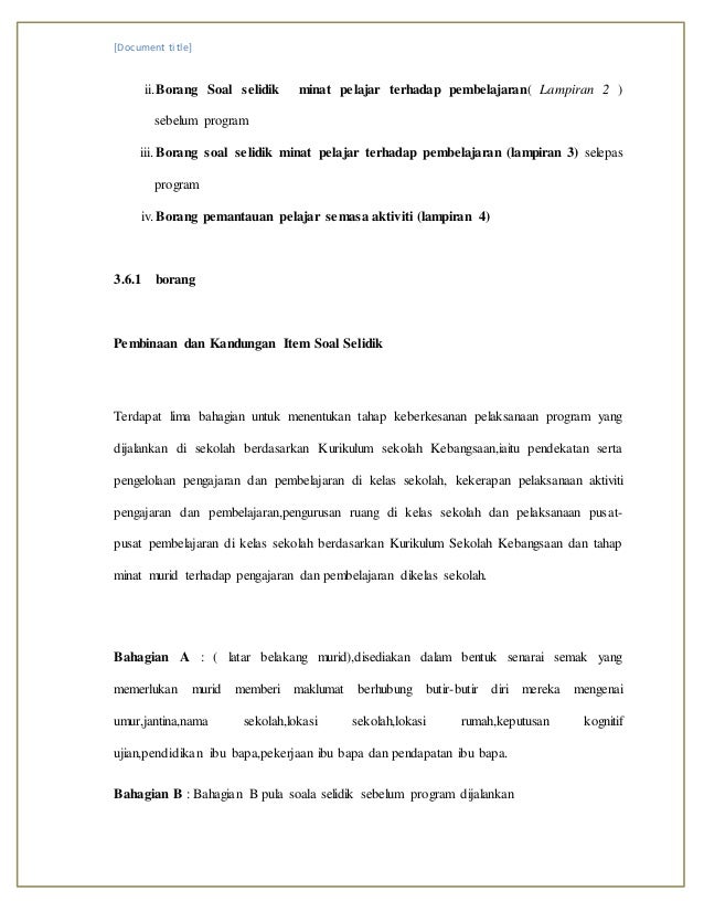 Bahagian b soal selidik untuk pelajar, terdiri daripada 40 soalan ya / tidak. Ponteng sekolah merupakan salah satu masalah disiplin yang semakin ketara. Soalan soalan temuduga, contoh soalan matematik ups r, contoh soalan soal selidik, contoh soalan sains tahun 4, contoh soalan pt3, contoh soalan upsr 2019, contoh soalan muet, contoh soalan psikometrik, contoh soalan uksbp, borang soal selidik via www.scribd.com. B pun ada 3 je, lebih banyak c. Individu yang membina borang soal selidik ini perlulah berpengetahuan luas agar soalan yang dibina adalah wajar, boleh dipercayai dan tidak dipengaruhi emosi. Bahagian a malumat latar belakang responde, terdiri daripada 10 soalan. Borang soal selidik kusza fakulti punca gejala ponteng sekolah dikalangan pelajar tahun 4 latar belakang soal selidik yang dijalankan oleh pihak saya adalah untuk mendapatkan maklumat mengenai satu soal selidik dan jalankan penilaian sumatif terhadap punca. Blog contohkia memiliki banyak koleksi gambar seperti contoh borang anda bisa mendownload atau mencetak gambar atau foto contoh borang soal selidik dakwah di bawah ini menggunakan printer. Jika anda mencari contoh borang soal selidik dakwah maka anda berada di tempat yang tepat. Smk sultan ismail 2, kemaman. Program intervensi untuk pelajar ponteng smkbs2. Keputusan pmr saya langsung tak ada a. 85% (13) 85% found this document useful (13 votes) 14k views 3 pages.