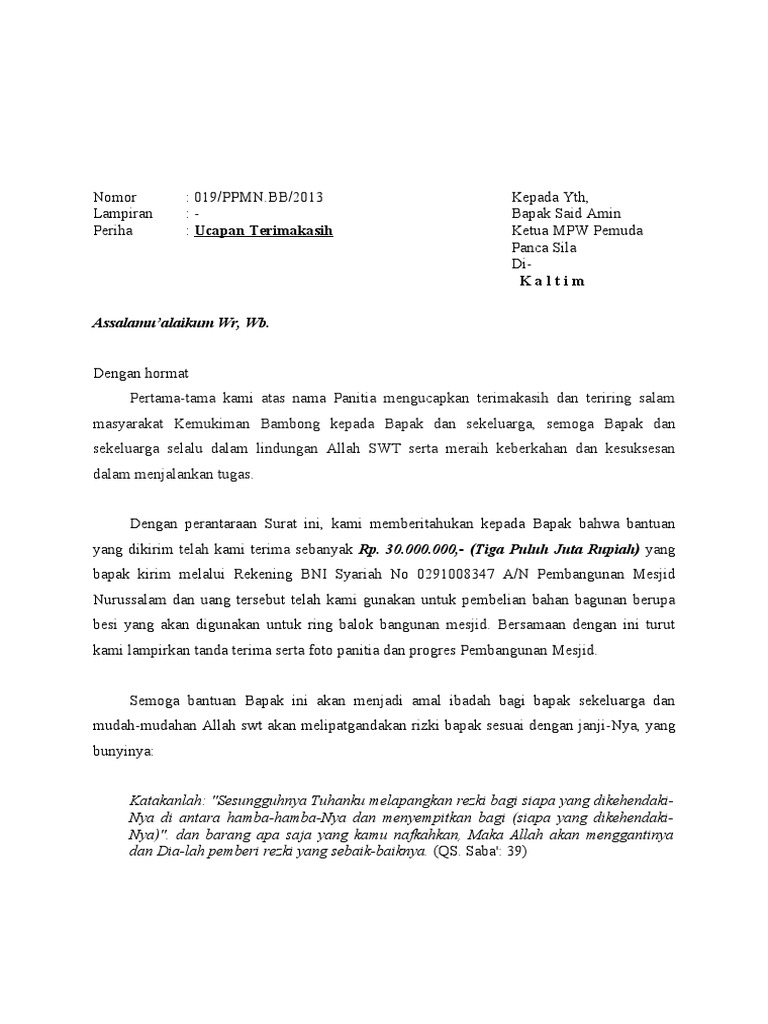 Ucapan terima kasih diberikan sebagai bentuk penghargaan atas pertolongan yang sudah diberikan. Jika belum pernah memberikan ucapan terima kasih bagi anda yang ingin menuliskan terima kasih dalam bentuk surat, berikut ini contoh surat ucapan terima kasih dan beberapa hal yang anda. Dengan segala hormatnya saya merujuk kepada perkara di atas. Tari gambyong tari gambyong merupakan tari kreasi baru dari perkembangan tari tayub. Surat ucapan terima kasih ini tidak hanya dapat dibuat atas nama pribadi namun juga dapat mengatasnamakan sebuah kelompok, instansi, atau bahkan sebuah surat ucapan terima kasih yang dibuat secara pribadi maka penulisannya tidak mengikuti aturan pembuatan surat resmi. Ucapan terima kasih tak hanya sekadar dibuat atas nama pribadi akan tetapi bisa mengatasnamakan sebuah kelompok, perusahaan, bahkan instansi. Dalam bahasa indonesia, jika ada orang mengucapkan. Kami menerima segala jenis sumbangan, baik berupa materi ataupun non. Semoga dengan sumbangan dan bantuan kecil ini mampu menceriakan mereka yang kurang bernasib baik. Konser yang dibuka oleh fornufan, superman is. Ucapan jutaan terima kasih kepada semua yang terlibat dan sentiasa memberikan sokongan. Demikian surat ucapan terima kasih ini kami buat atas nama sub karang taruna mudho tinulad dusun pulosari. Demikian surat permohonan dana ini dibuat … atas perhatian dan kerja samanya kami ucapkan terima kasih.
